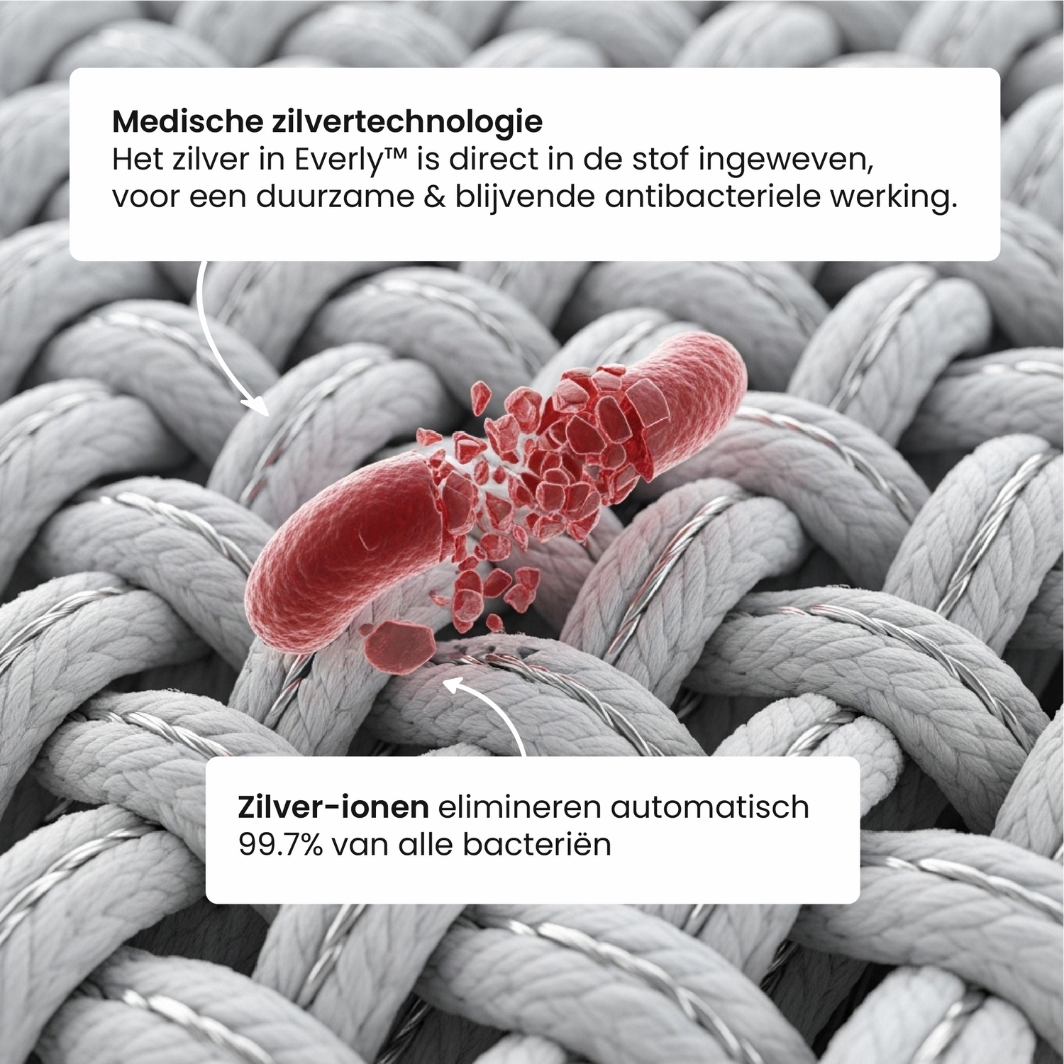 Het zilver elimineert 99,7% van bacteriën op contact via een proces genaamd ionizatie.